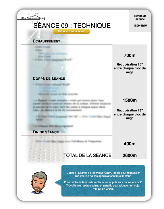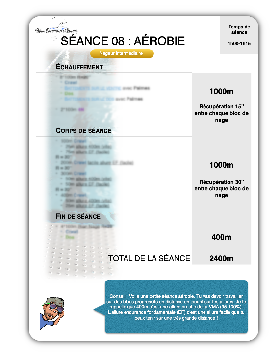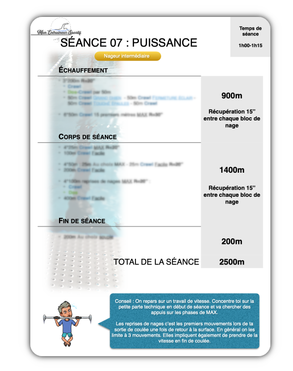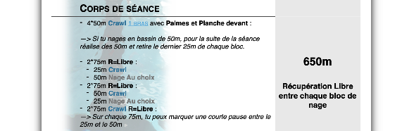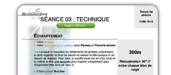 On suit les exercices les uns derrière les autres (de haut en bas). Vous disposez de toutes les informations nécessaires à leur réalisation : temps de récupération, intensité de nage etc.